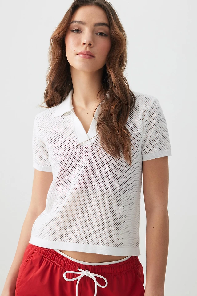 Ardene Open Knit Polo Shirt in White | Size | Polyester/Nylon | Eco-Conscious