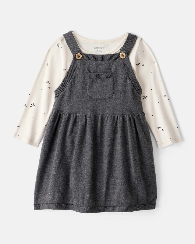 Baby Girl Bow Print Cotton Long-Sleeve Dress Set - White/Grey