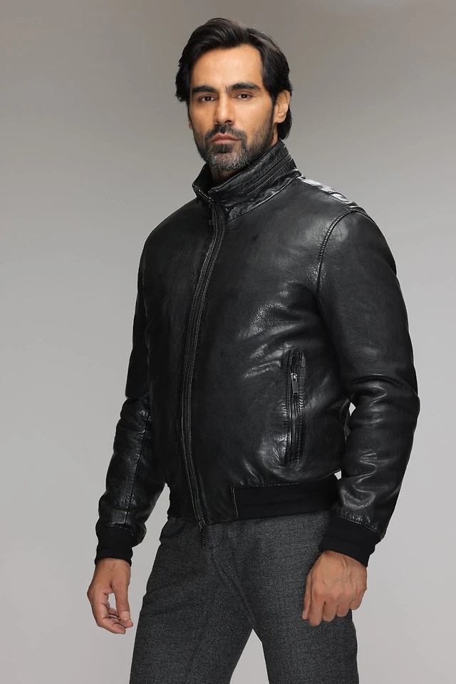 DION Genuine Shrunken Leather Bomber Jacket