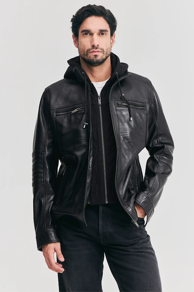 RYLEY Genuine Leather Hooded Bomber Jacket