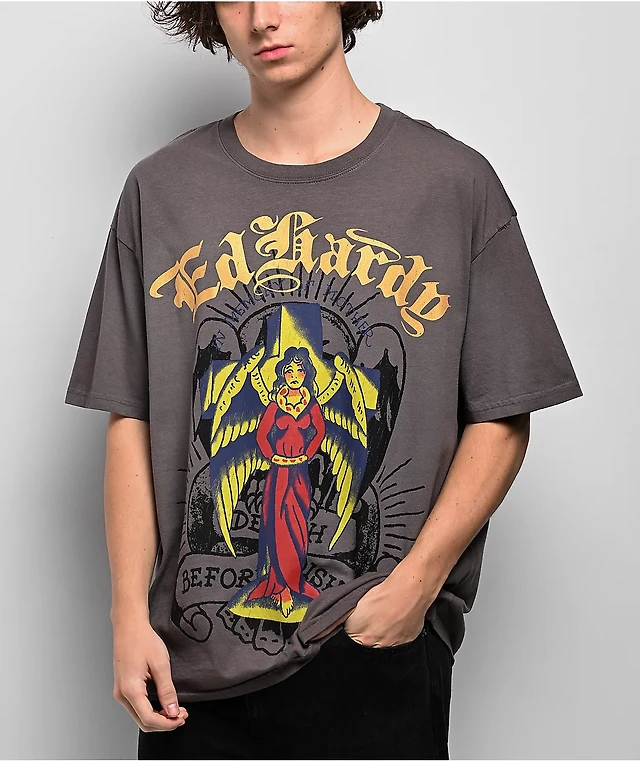 Ed Hardy Cross Heart Charcoal Boxy T-Shirt