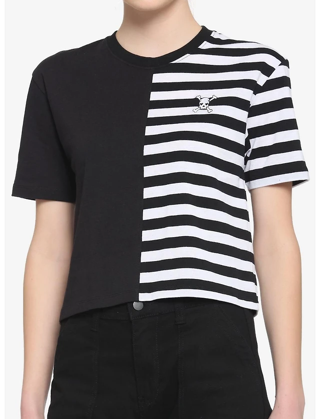 Black & White Stripe Split Girls Boxy Crop T-Shirt