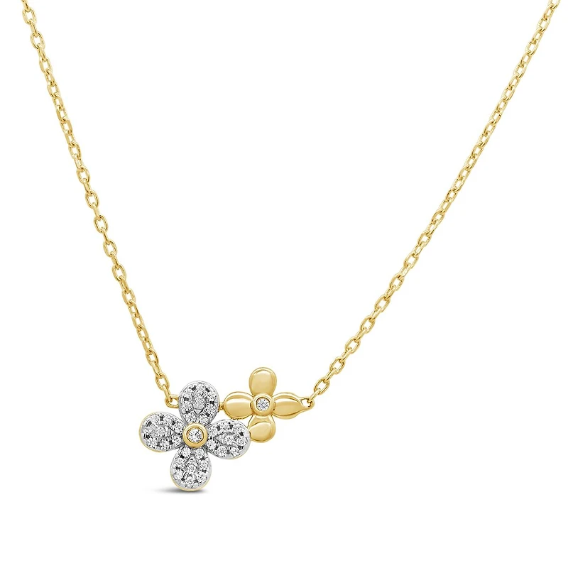 Blooming with charm, this 0.10CTW Diamond Flower Necklace in 10K Yellow Gold showcases two delicate blossoms—one adorned with pavé diamonds and the other in polished gold—capturing the beauty of nature in an elegant design.