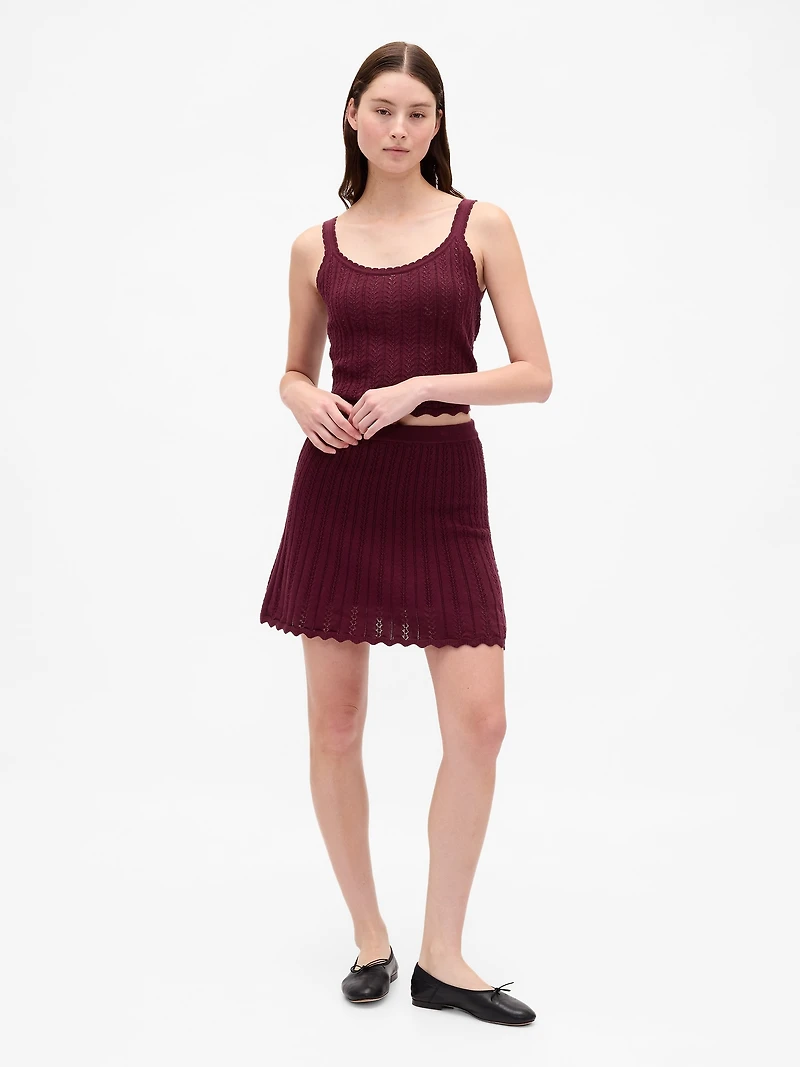 Soft cotton sweater knit mini skirt. Elasticized rib waistband. Allover pointelle stitch design. Scalloped rib hem.