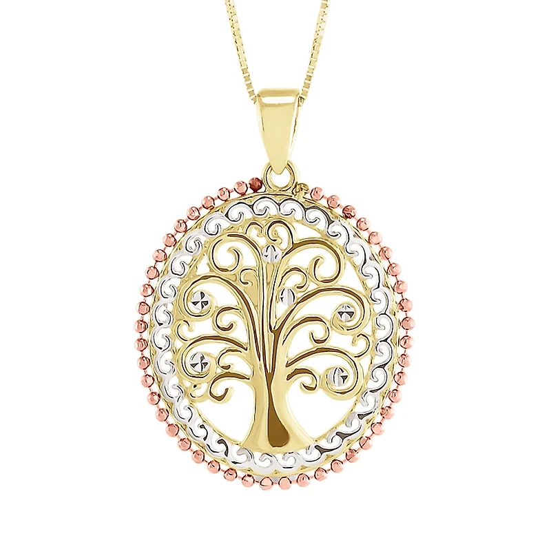Offering depth and meaning, this tri-coloured gold tree pendant would make a perfect addition to any outfit. Symbolizing, strength, wisdom and beauty this pendant is completed by an oval frame and comes with a yellow gold chain.