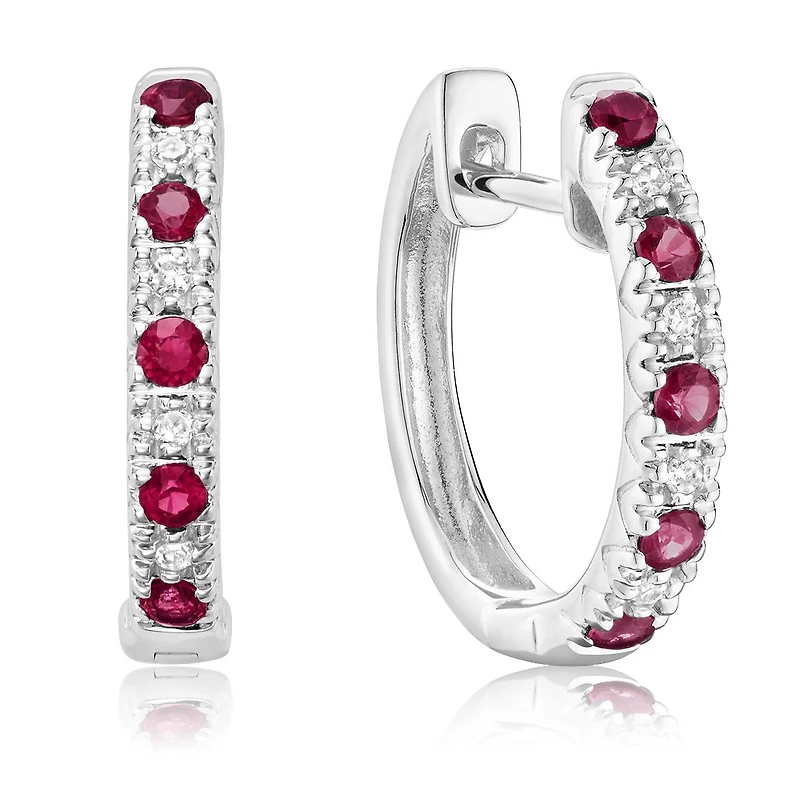 Crafted in radiant white gold, these earrings feature a delicate yet captivating combination of diamonds and vibrant rubies. Their understated elegance and rich gemstone accents make them a perfect choice for adding a touch of luxury and charm to your look, whether for a special occasion or everyday wear.