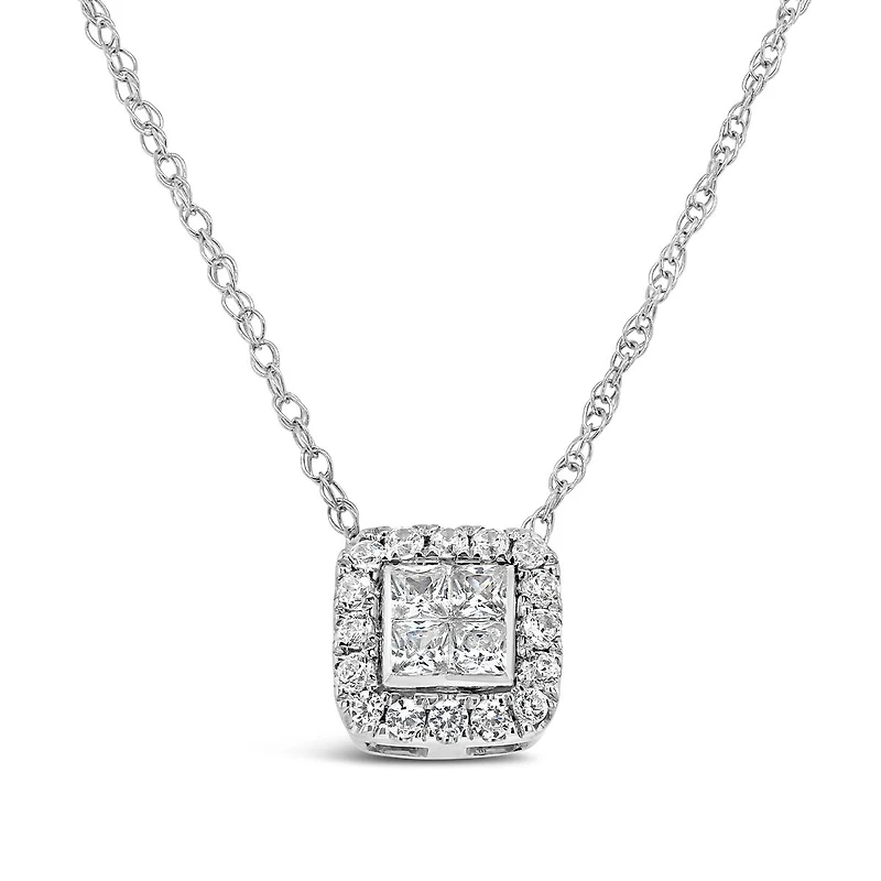 Add a bit of sparkle to her life with this breathtaking 0.50CTW diamond princessa pendant. Four gorgeous princess cut diamonds sit proudly surrounded by sixteen perfectly cut round brilliant diamonds. Masterfully crafted in 10K white gold, and delicately suspended from a gleaming 18in chain, this necklace is the perfect gift for any special occasion.