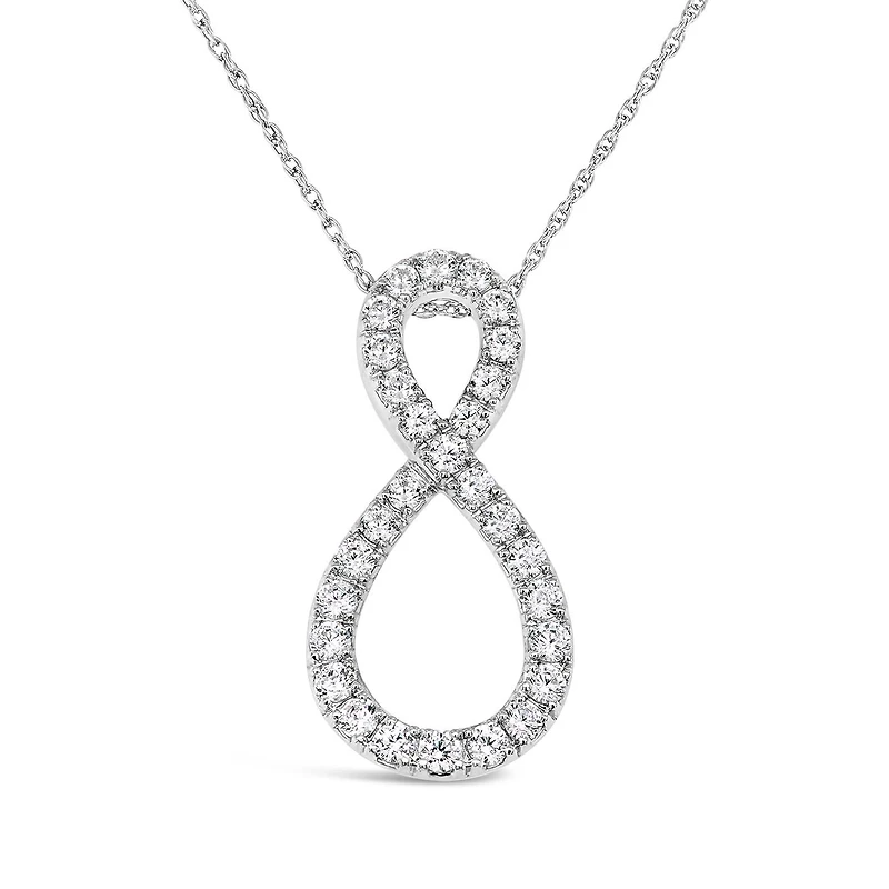 Captivate the room in this breathtaking diamond infinity pendant. With over 25 perfectly round cut diamonds, this necklace boasts 1.00CTW of sparkle. Set in impressive 10K white gold, with an 18in chain, this necklace is suitable for day or nighttime wear.