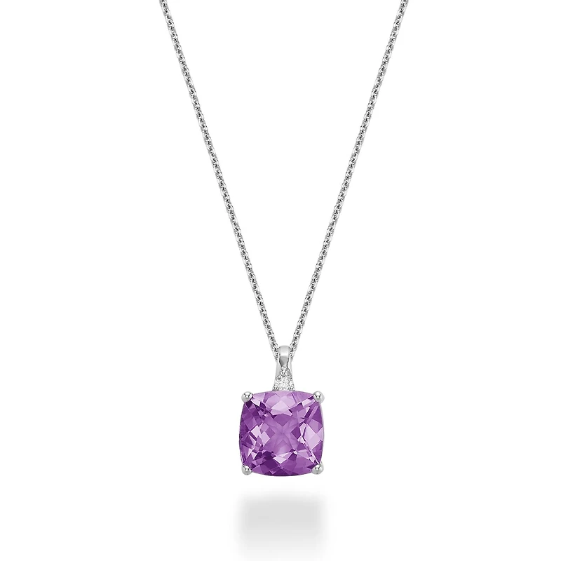 Simple and timeless, this gorgeous pendant is crafted in 10-karat white gold and features a cushion-cut amethyst accented by a  round-cut diamond. A classic look, this stunning piece is a perfect choice for today's contemporary and sophisticated person.