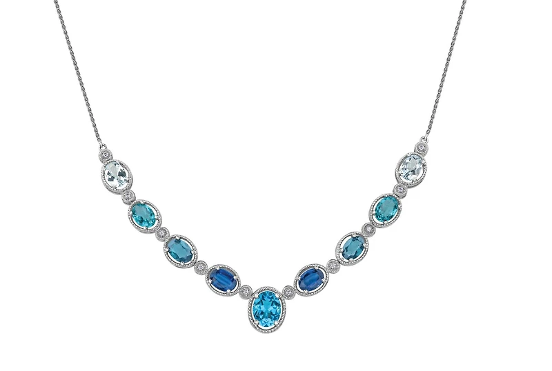 This bold and bright necklace is crafted in 10K white gold and features Blue Topaz, Kyanite, Apatite and Aquamarine gemstones accented by shimmering diamonds. Enhanced with a high polish finish, this darling necklace is the perfect addition to any jewellery collection. This alluring gemstone and diamond necklace is the perfect choice either for yourself or as a gift for someone you love.