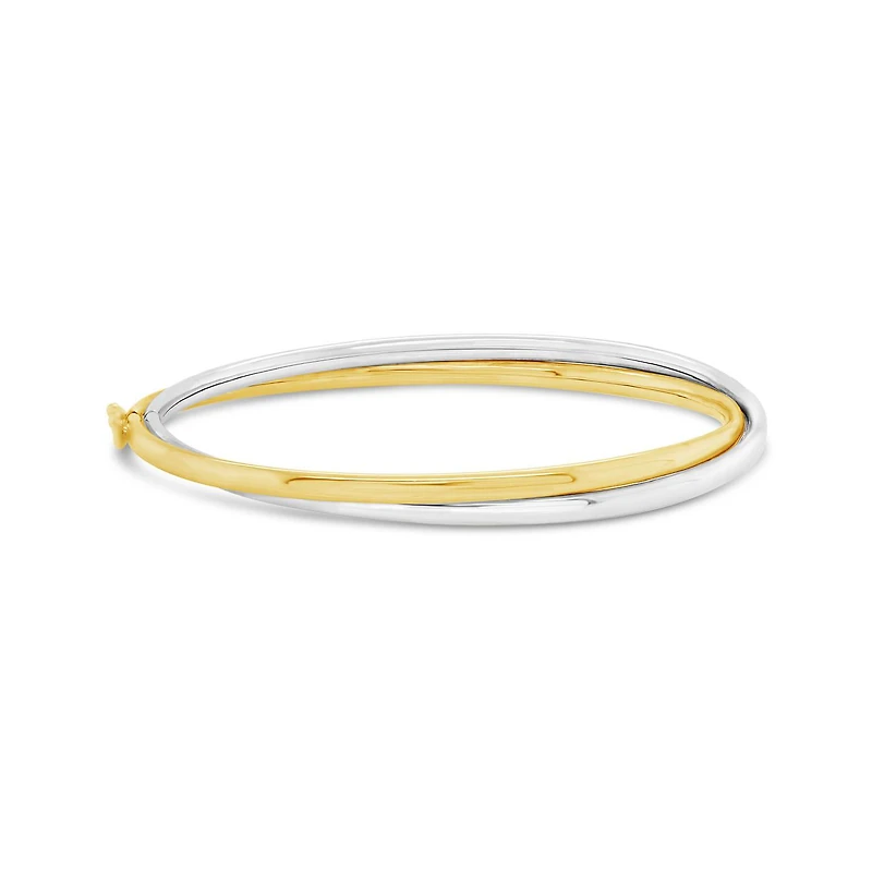 This classic yet trendy hinged bangle is crafted in lustrous 10K yellow and white gold. This bracelet is a perfect way to add a touch of elegance and sophistication to any ensemble. This stunning piece makes a lovely addition, suitable for all occasions.