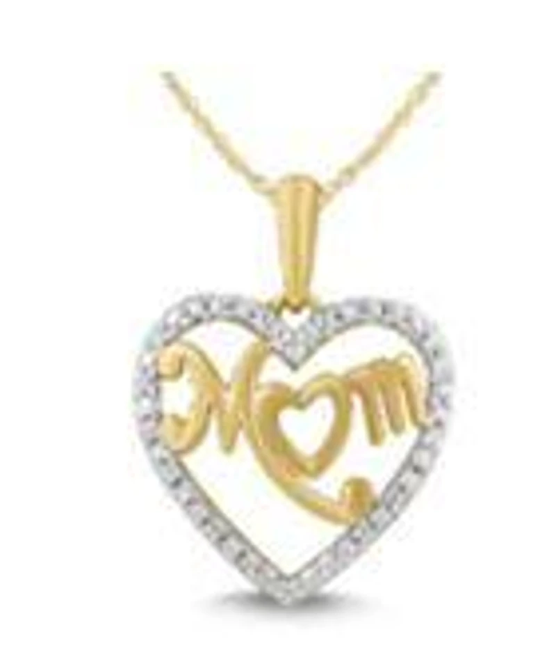 A heart containing 0.05ctw of sparkling diamonds surround a graceful "Mom" crafted in 10kt yellow gold. Suspended from a 16" rope chain and secured with a spring ring clasp, Mom will love this precious pendant.