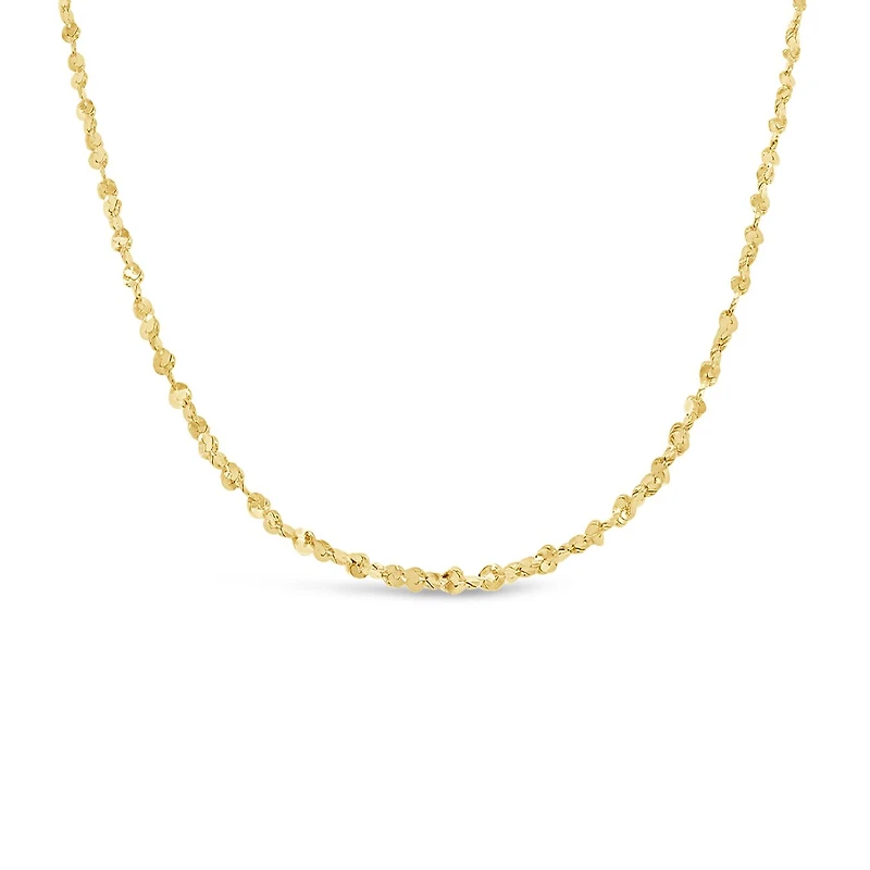 This chain features a graceful serpentine link design, showcasing a series of sinuous and interlocking links that create a sleek and fluid texture. The fine 0.9mm width adds a touch of understated elegance, making it a versatile accessory for various occasions. The lustrous 10K yellow gold construction enhances the chain's enduring beauty, offering a perfect blend of classic charm and modern versatility.