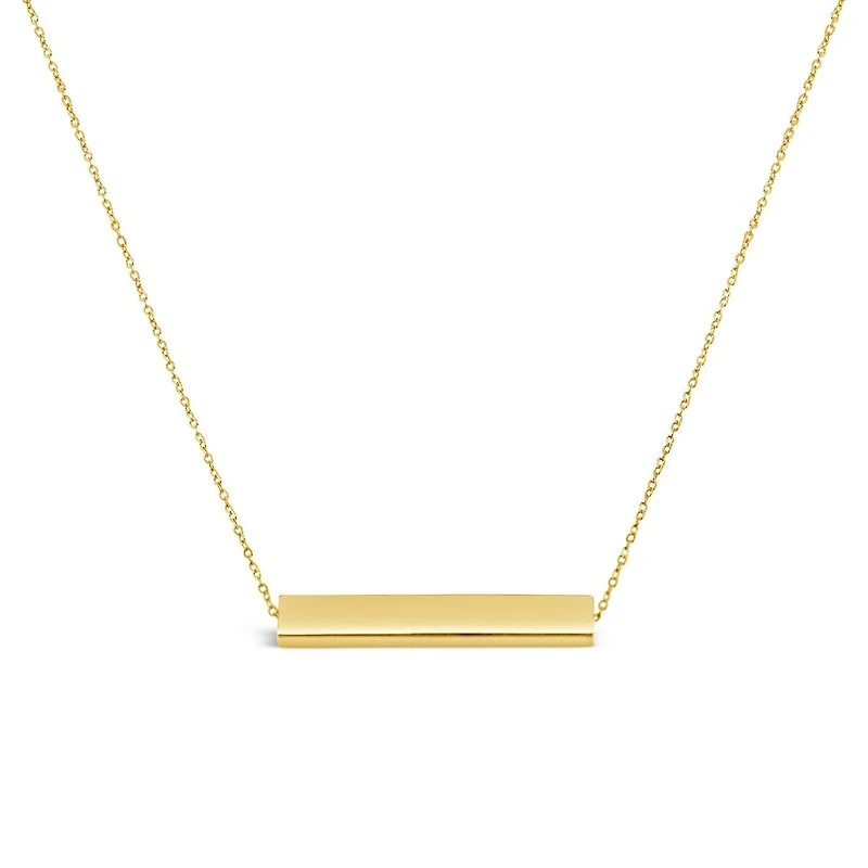 Highly polished 10kt yellow gold creates this beautiful bar necklace.  The split cable link chain is 18" in length and is secured with a spring ring clasp. The perfect delicate statement piece to add to your outfit.