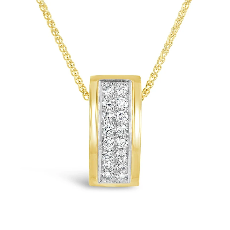 Trendy yet elegant, this spectacular 10kt yellow and white gold diamond pendant is a classic style. Shimmering with 0.50ctw of sparkling round diamonds, the pendant is suspended from an 18" wheat link chain.