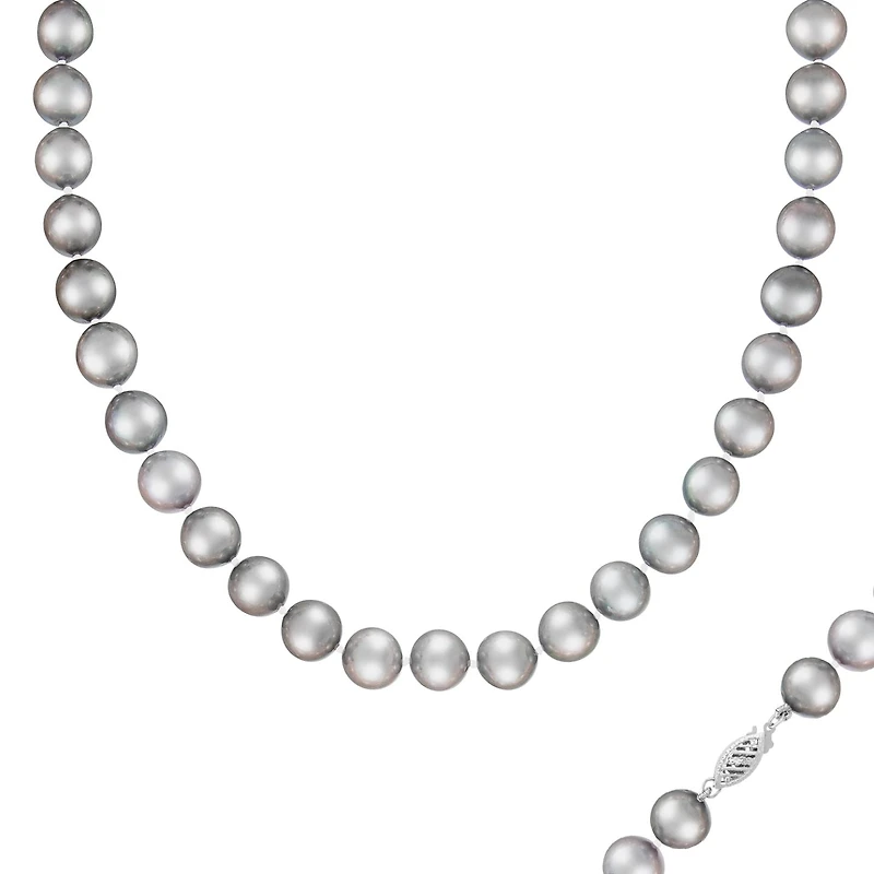 A 10mm gray freshwater pearl 18" necklace, individually hand knotted with a 14k white gold filigree clasp