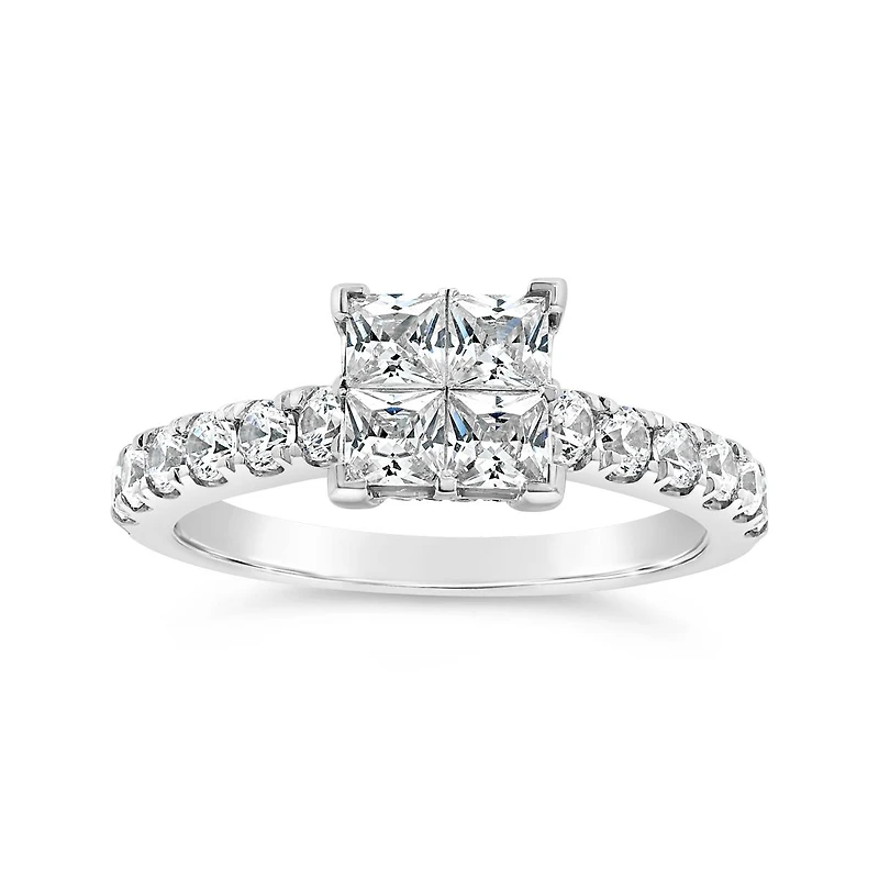 Elevate your love story with the timeless elegance of this 14K White Gold 1.52CTW Princessa Diamond Bridal Ring. The captivating design features a prominent arrangement of four princess shaped diamonds in the center, creating a stunning visual focal point. The surrounding hidden halo of smaller diamonds enhances the overall radiance and adds a touch of sophistication. This bridal ring is a symbol of enduring love, blending classic charm with a modern aesthetic.