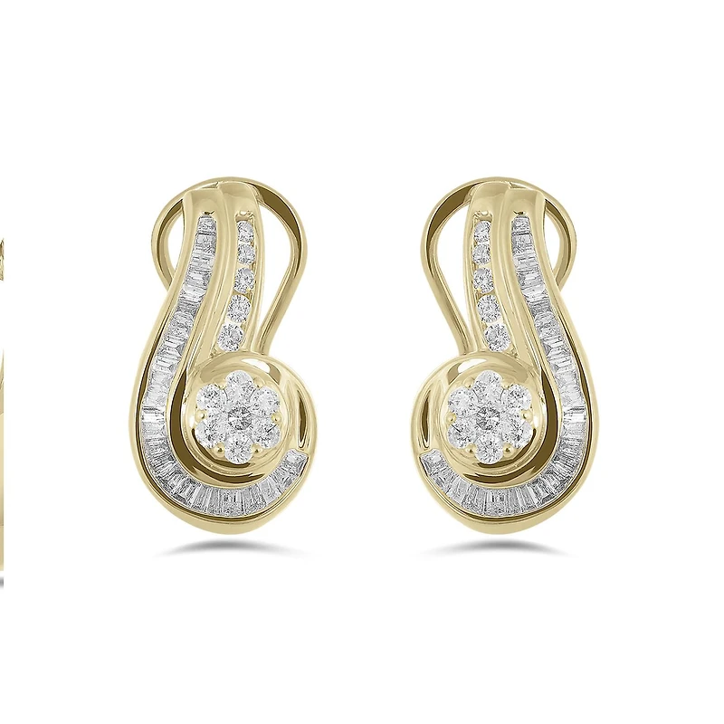 These whimsical spiral earrings are beautifully fashioned from shining 14kt yellow gold. They feature a bouquet of glittering round diamonds accented by both round and baguette cut diamonds totalling 0.50ctw. Secured by a post and Omega back, these earrings are the epitome of sophistication.
