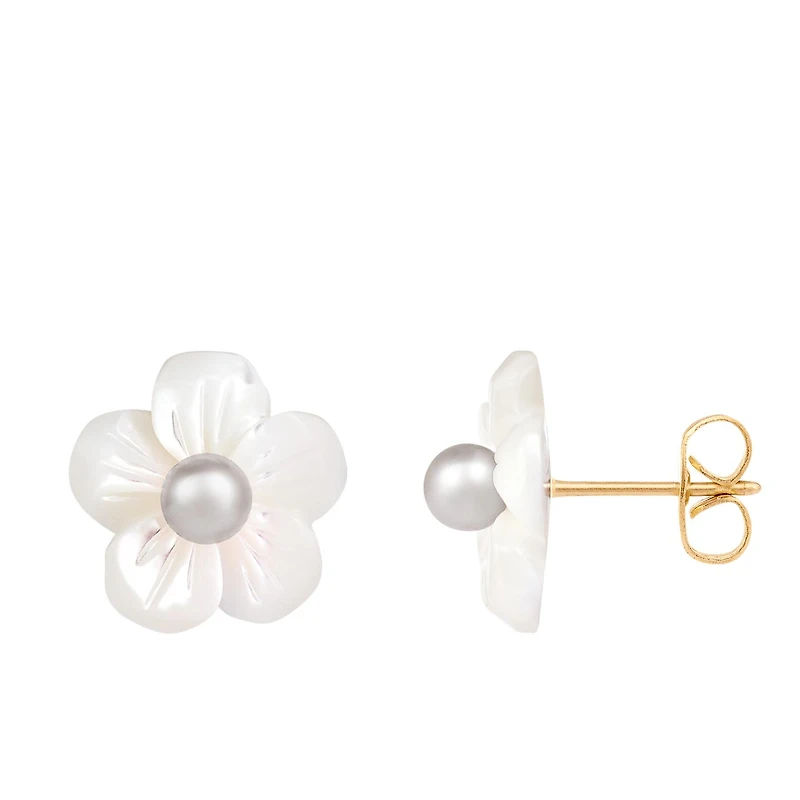 These 14K yellow gold stud earrings feature a combination of 4-4.5mm freshwater pearls and 10mm mother of pearl, offering a sophisticated and timeless design. The smooth, lustrous pearls complement the iridescent glow of the mother of pearl, creating an elegant and versatile accessory perfect for both casual and formal wear.