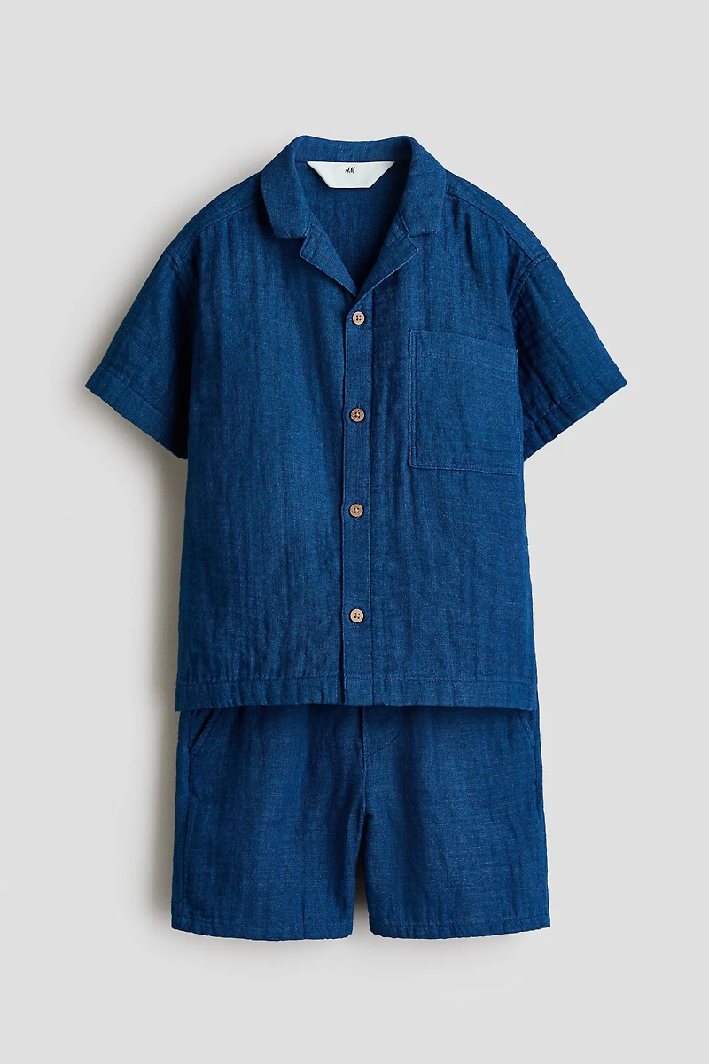 Set in soft cotton muslin with a resort shirt and matching shorts. Short-sleeved shirt with a resort collar, buttons at front, and a patch chest pocket. Knee-length shorts with adjustable elastic at waistband, mock fly, diagonal side pockets, and an open back pocket.