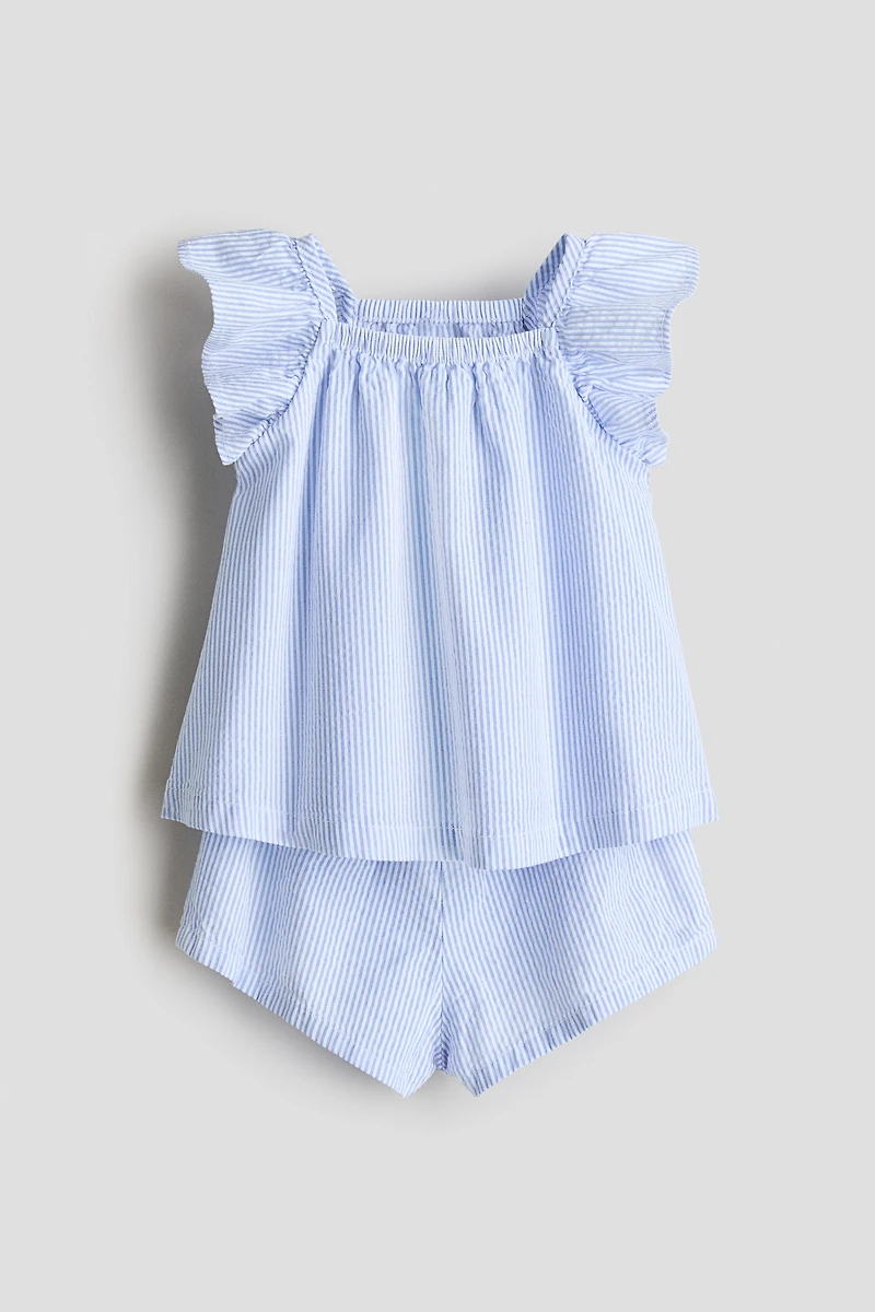 Set with a top and shorts in an airy, woven fabric. Top with flutter sleeves and square neckline at front and back with covered elastic. Shorts with covered elastic at waistband.