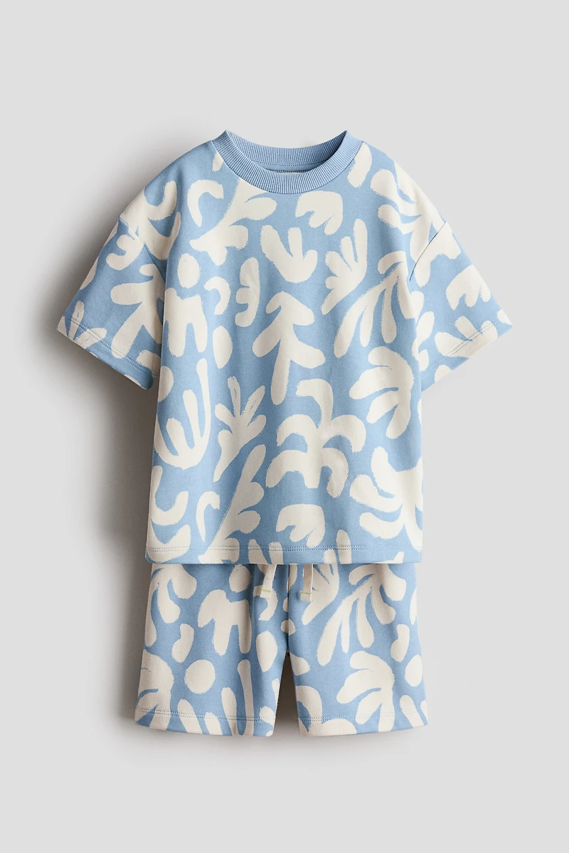 Set in lightweight sweatshirt fabric with a T-shirt and shorts, both with a printed pattern. T-shirt with a ribbed round neck and dropped shoulders. Shorts with elasticized, drawstring waistband.