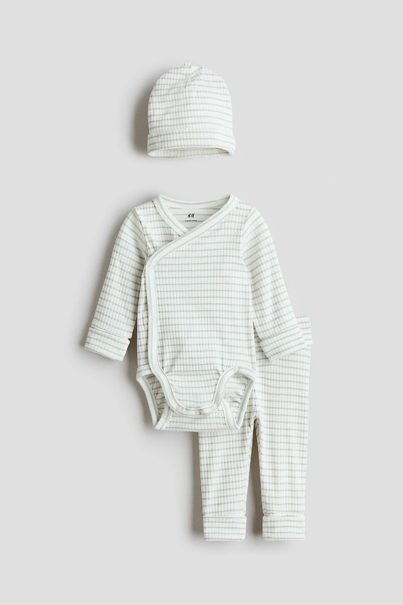 Set in soft cotton jersey with a bodysuit, pants, and a beanie. Designed to grow with your baby. Wrapover bodysuit with long sleeves and extra-long cuffs to unfold as baby grows, snap fasteners at sides, and two rows of snap fasteners at bottom for adjustable length. Gathered seam around leg openings for added comfort and improved fit over diaper. Pants with a foldover waistband panel and extra-long cuff at hems. Beanie with foldover cuff.