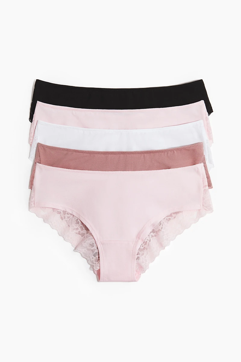 Hipster briefs in jersey and lace with a mid waist, lined gusset and cutaway coverage at the back.