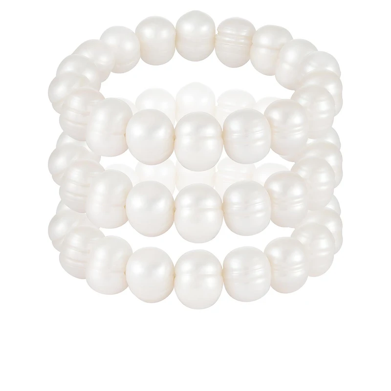 This set of three elastic bracelets features 9-10mm white freshwater pearls, creating a refined and elegant look. The stretchy design ensures a comfortable fit, while the lustrous pearls add a sophisticated touch to any outfit. Perfect for stacking or wearing individually.
