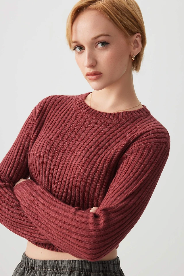 Ardene Crop Crew Neck Sweater in Burgundy | Size
