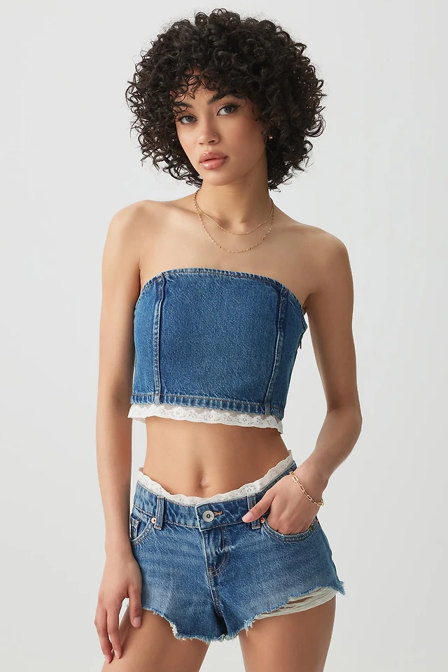 Ardene Lace Trim Denim Tube Top in Medium Blue | Size | 100% Cotton