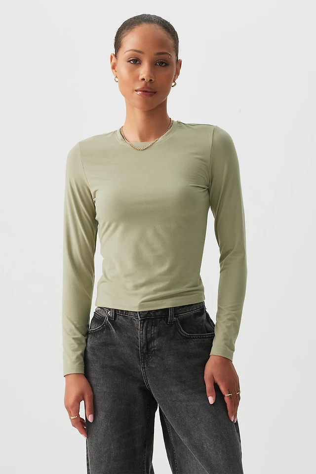 Ardene Long Sleeve Crew Neck T-Shirt in Sage | Size | Polyester/Elastane
