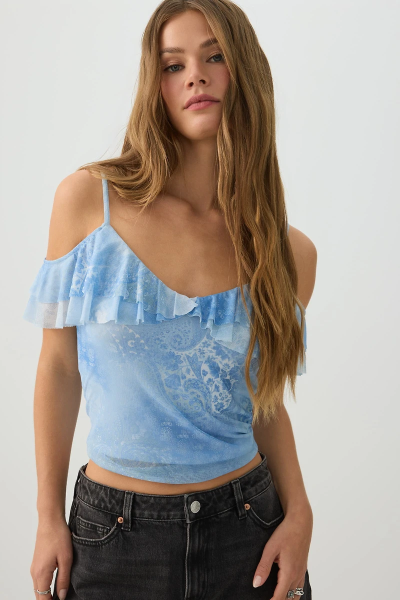 Lined mesh top. V-neckline with ruffle detail Thin straps Short sleeves Model is wearing size SComposition & Care 94% polyester, 6% elastane Machine wash in cold water in delicate Do not bleach Lay flat to dry Do not iron Do not dry-clean | Ardene Mesh Cold Shoulder Short Sleeve Top in Medium Blue | Size XS | Polyester/Elastane