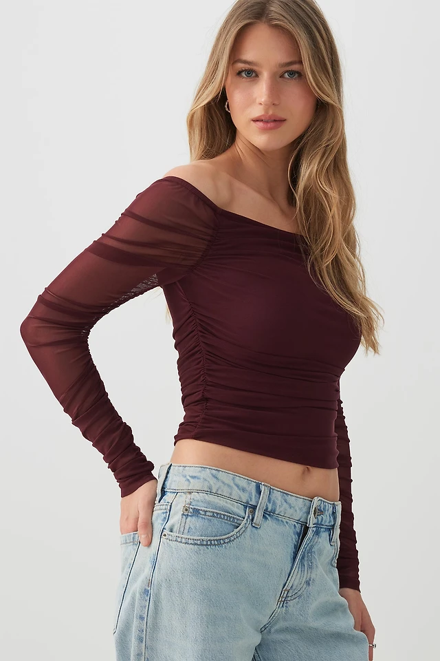 Ardene Off Shoulder Ruched Mesh Top in Burgundy | Size | Polyester/Elastane