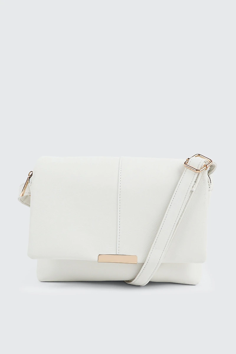 Eco-conscious faux leather crossbody bag. Snap flap closure 2 zippered compartments Adjustable strap Exterior: 100% polyurethane Lining: 100% recycled polyester Height: 7 in Length: 9 in Width: 2 in | Ardene Rectangular Crossbody Bag in White | 100% Recycled Polyester/Faux Leather | Eco-Conscious
