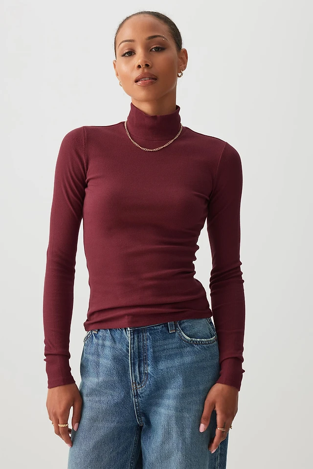 Ardene Rib Turtleneck Sweater in Burgundy | Size | Cotton/Elastane