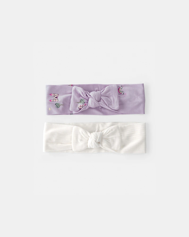 - Purple headband features fairytale print, white headband has no print.