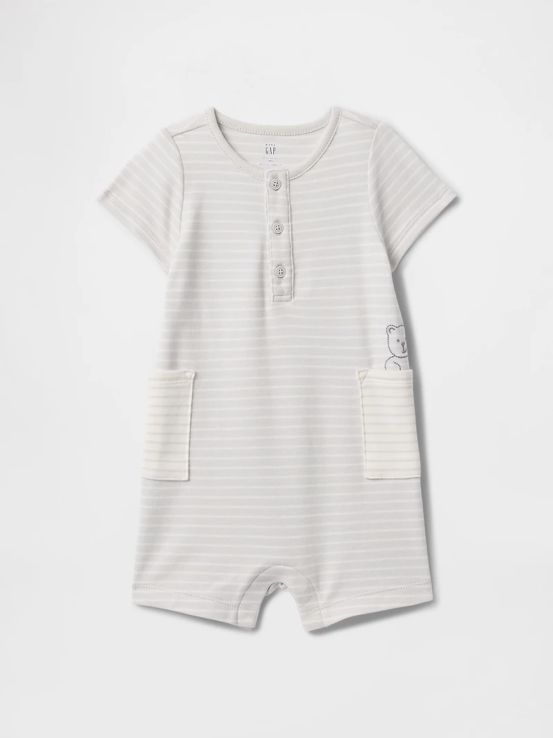 Soft cotton shorty one-piece. Crewneck with front button placket. Short sleeves. Side patch pockets. Embroidered Brannan Bear detail at side. Snaps at inseam for easy dressing and diapering. Allover stripes. 100% of the cotton in this shorty one-piece is verified by the U. S. Cotton Trust Protocol, a program which works with farms committed to improving their environmental footprint by minimizing water usage and improving soil diversity (Claim No. B6AFDACC-10117). This product was made in a factory that invests in gender equality and women’s empowerment. Through RISE (Reimagining Industry to Support Equality) and Gap Inc. ’s program P. A. C. E. (Personal Advancement & Career Enhancement), we support people who make our clothes to build the skills, knowledge, confidence, and resilience needed to advance in work and life. .Learn more.here.