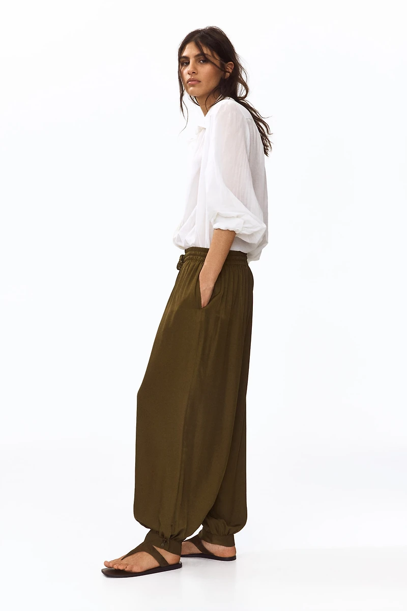 Loose-fit pants in woven fabric with a slight sheen. Gathers at top and at hems for added volume. Smocked elastic and a narrow drawstring at waistband, discreet side pockets, and balloon legs with cuff and buttons at hems.