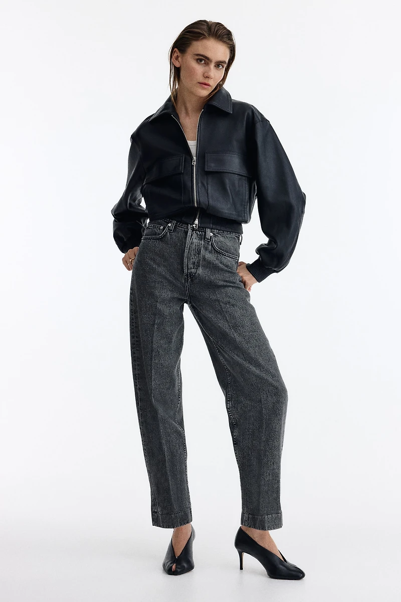 5-pocket jeans in rigid cotton denim that feels firm at first, softening and relaxing with wear. Regular fit from hip to thigh, tapering to hem. High waist and button fly. Curved, voluminous, ankle-length legs with creases at front and back. A relaxed and cool denim statement.