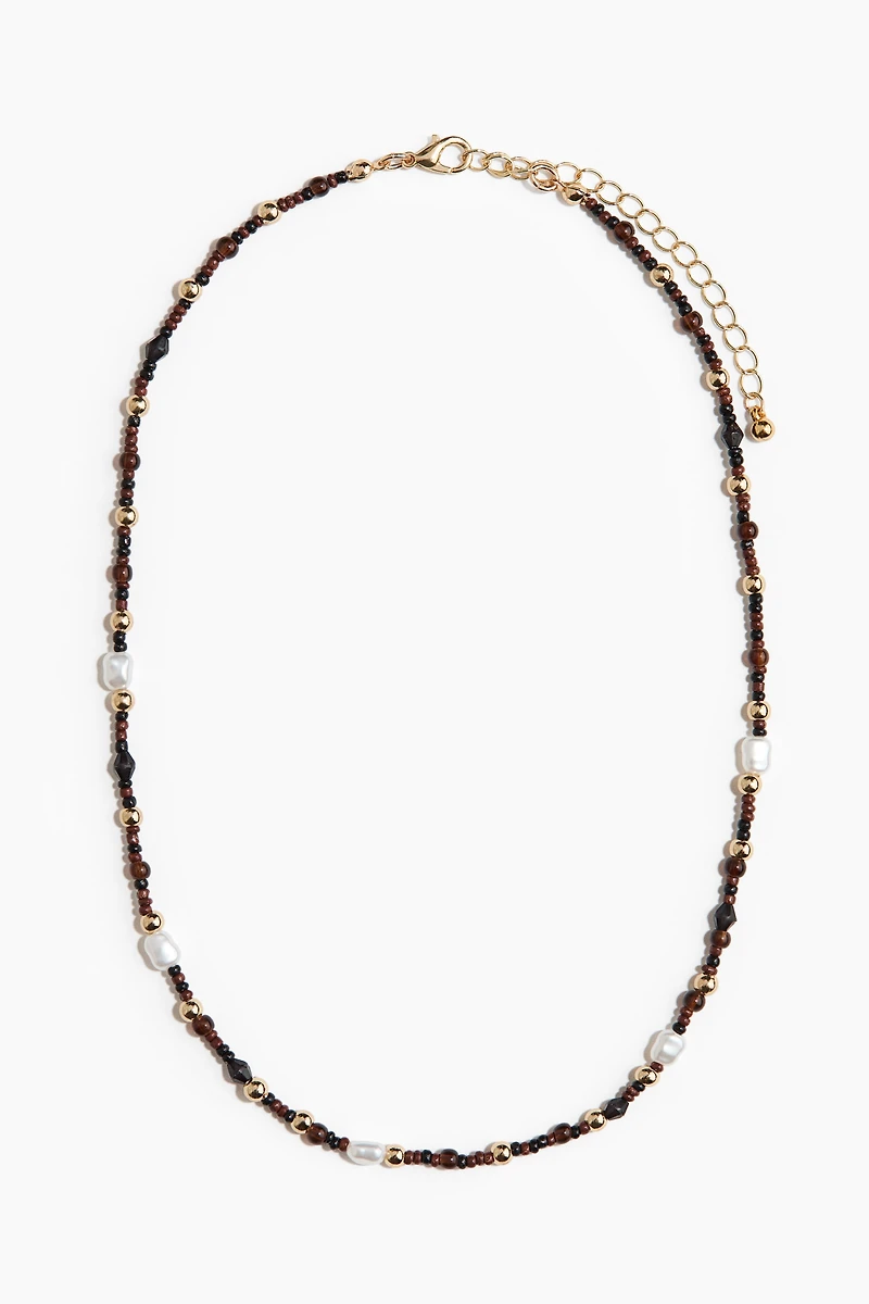 Necklace made of a string of beads in various shapes and sizes. Adjustable length with trigger clasp.