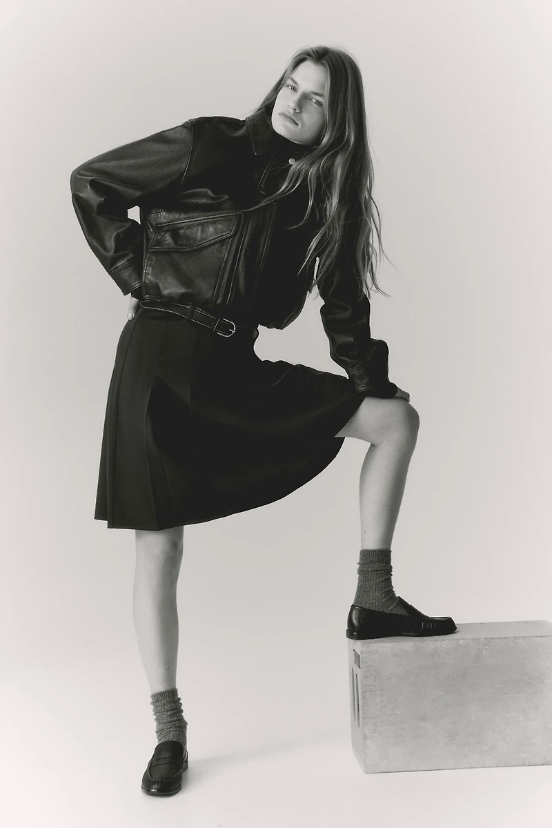 Knee-length skirt in pleated jersey. High waist, concealed elastic at waistband, and a belt in coated fabric.