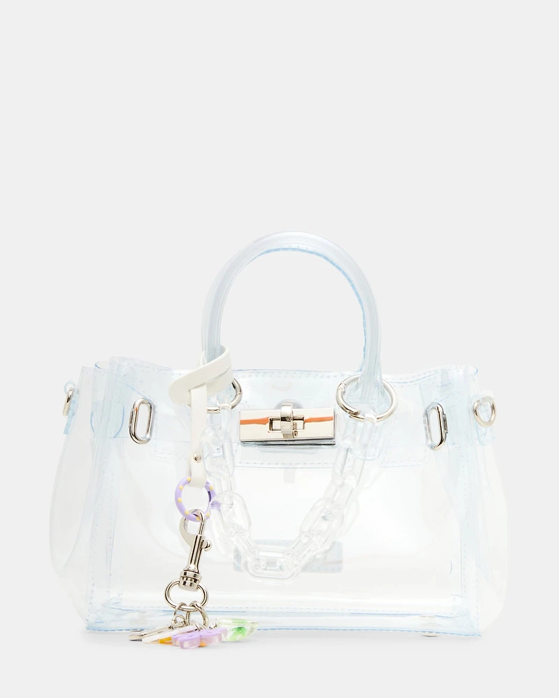 The BGUMMY-M bag combines transparent design with eye-catching prints for a modern accessory that showcases your style. Featuring dual top handles for comfortable carrying, this tote works seamlessly for daily errands or weekend outings. Customize your look with attachable bag charms that add personality and flair. The clear construction offers practical visibility while maintaining a contemporary aesthetic that pairs effortlessly with any wardrobe.