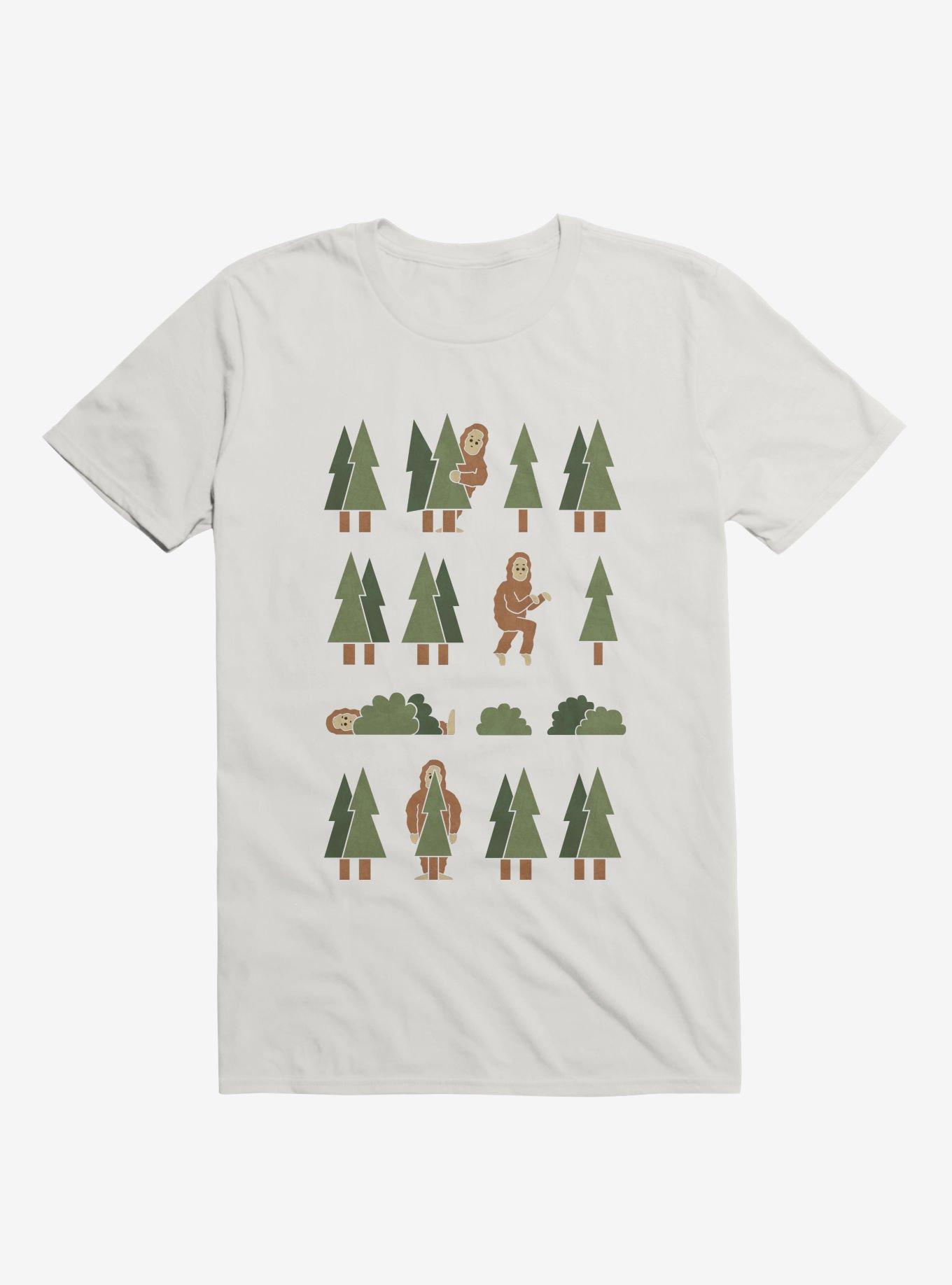 Peek-a-boo! This lightweight white graphic tee features rows of trees and -- Ooh, look! There! No, over there! -- the elusive Bigfoot trying his best to hide. Officially licensed art from handsoffmydinosaur.