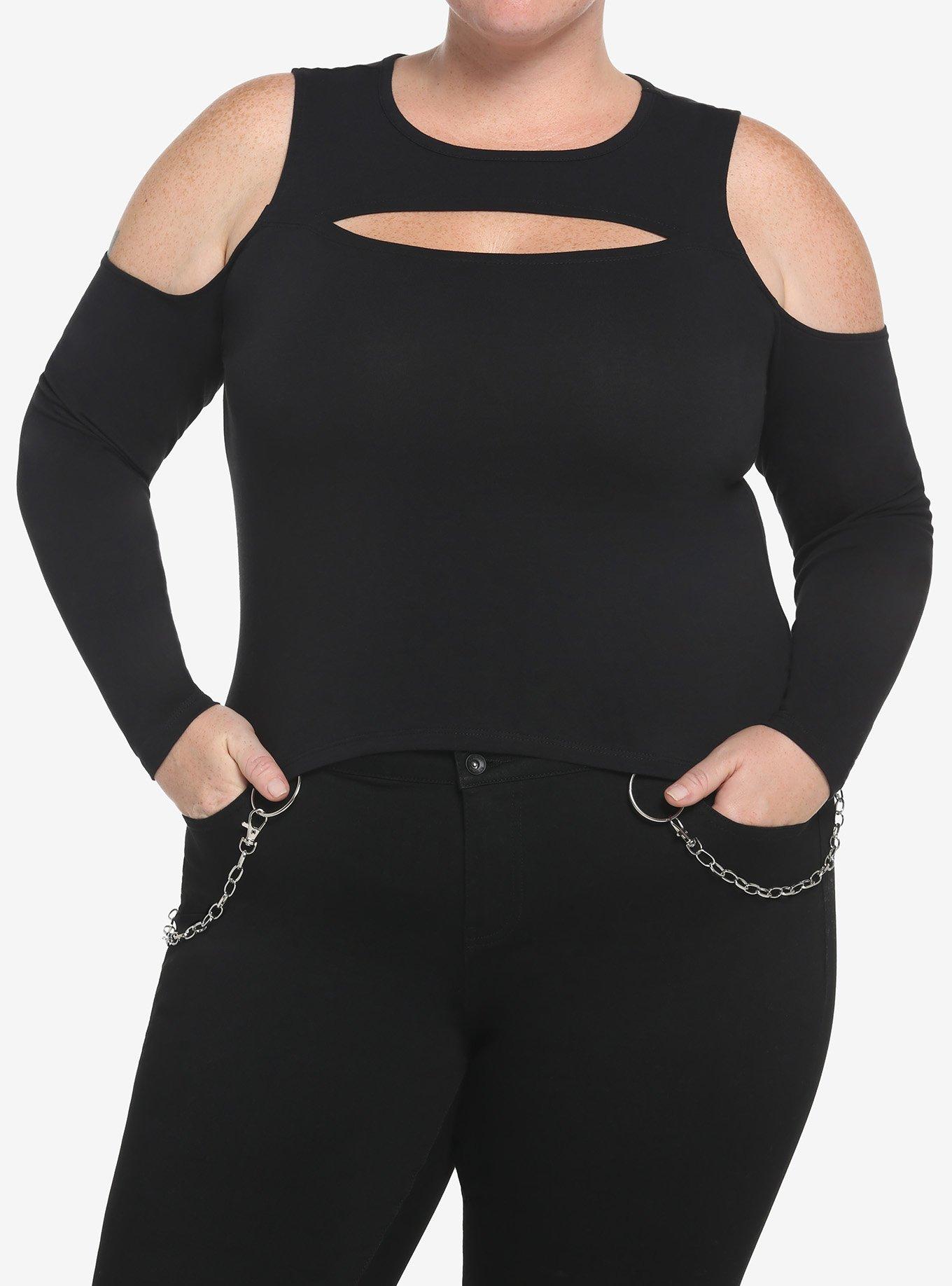 This black long-sleeve top is anything but basic. It features a cutout accent on the front and cold shoulder detailing.