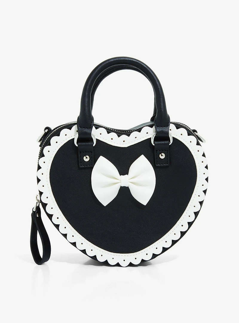 We've got the perfect purse for your lolita coord! This bag is heart-shaped and black with white bow and white lace-shaped detail. Silver-tone hardware and top carrying straps.