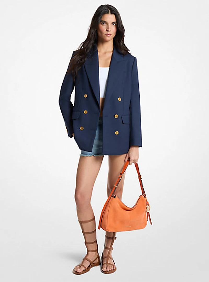 This double-breasted blazer takes its cue from classic menswear in a chic oversized fit with peak lapels that strengthen its shape. It’s tailored from wool-blend twill with a hint of stretch and topped with gilded buttons for a touch of glamour. Balance its proportion with a crop top and denim shorts.