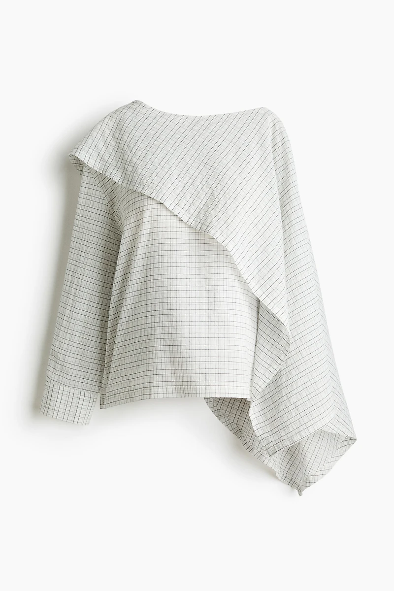 Blouse en crépon de coton légèrement extensible. Modèle à encolure ronde avec panneau asymétrique style cape en haut. Manches longues terminées par poignet boutonné. Bas droit avec fentes latérales.