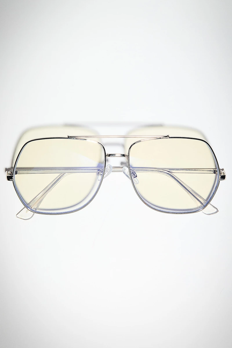 Aviator-style eyeglasses with frames in metal, adjustable nose pads, and transparent lenses in plastic with special coating to filter out blue light from digital screens.
