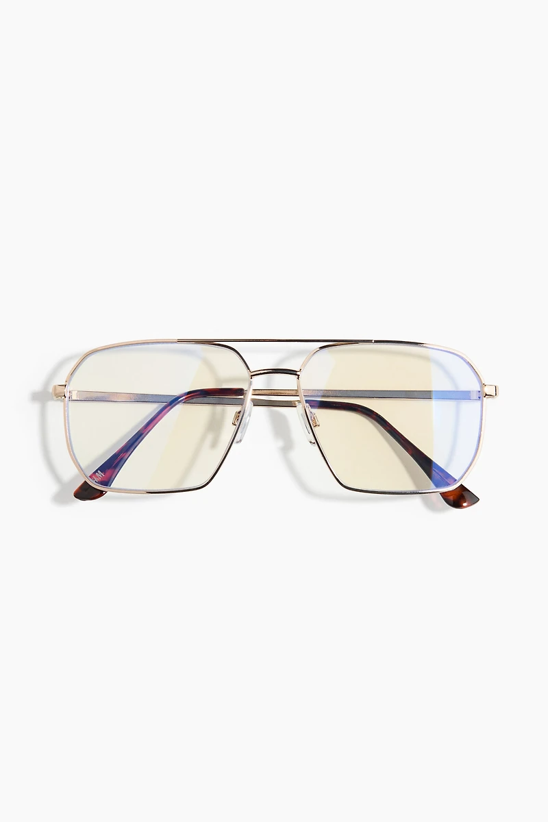 Eyeglasses with frames in metal. Transparent lenses in plastic with special coating to filter out blue light from digital screens.